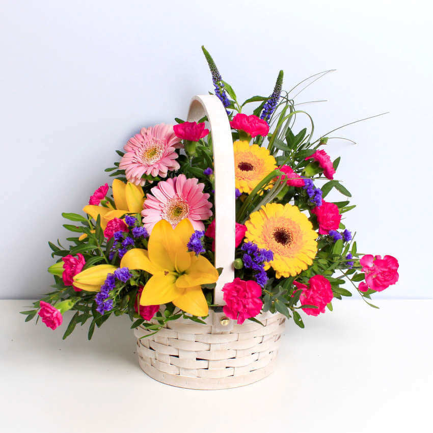 The Arcadia Basket is a colourful combination of seasonal, hand tied flowers arranged by an expert local florist. It will brighten up anyone’s day and will bring a sense of joy and happiness to all those who receive this classic basket design.