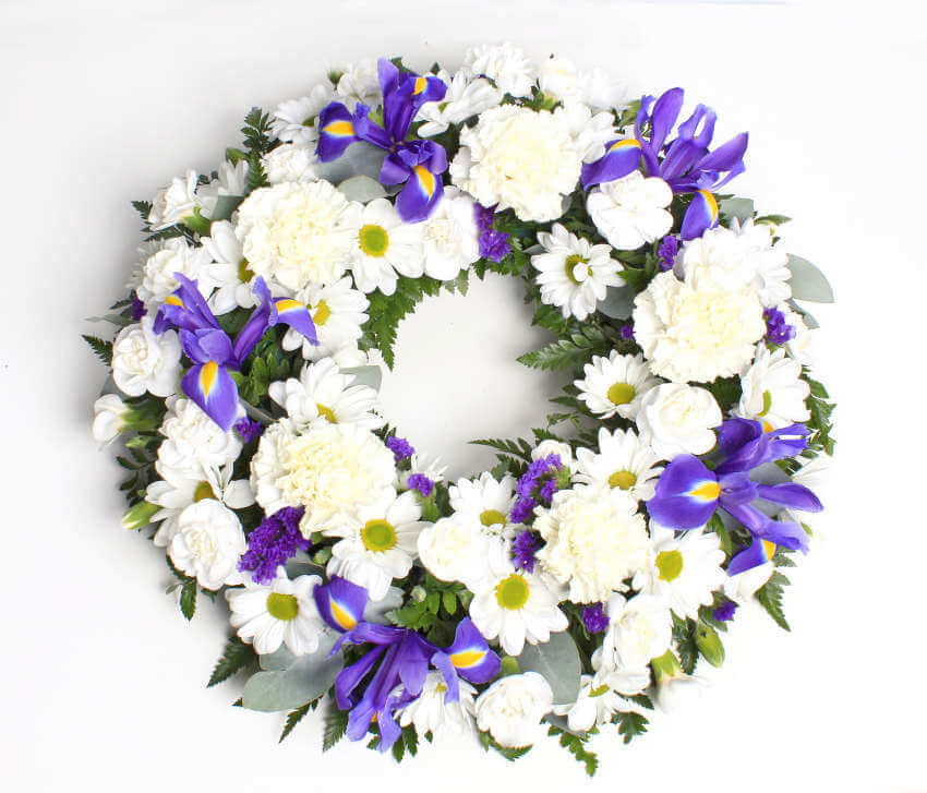 Express your deepest condolences with this lovely Blue and White Wreath, these fresh hand tied flowers make a memorable commemorative display and features Iris, Carnation and Chrysanthemum.