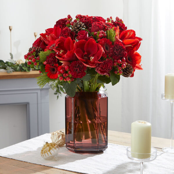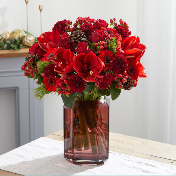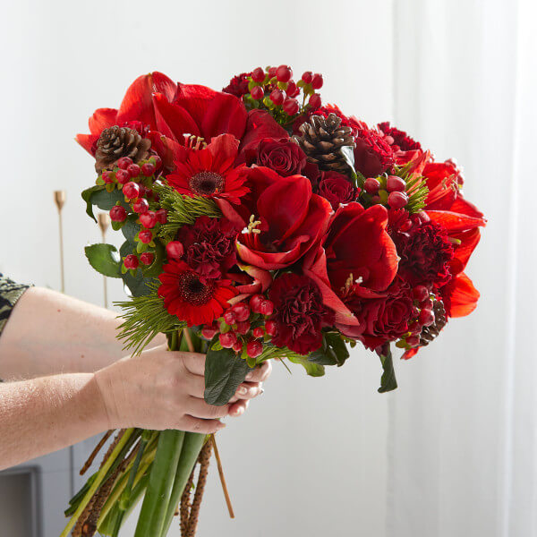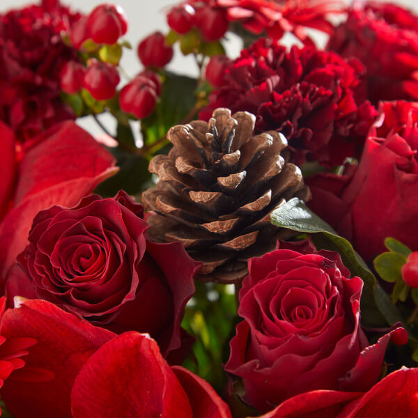 Instantly add cheer with this classic Christmas bouquet. Featuring festive reds and deep greens with textured pinecones, it is a magnificent bouquet to welcome winter festivities. We cannot deliver this item to Northern Ireland, Isle of Wight, Isle of Man, Channel Islands, Highlands of Scotland and Aberdeen, Jersey, Guernsey, Scilly Isles, Argyll, Shetland.