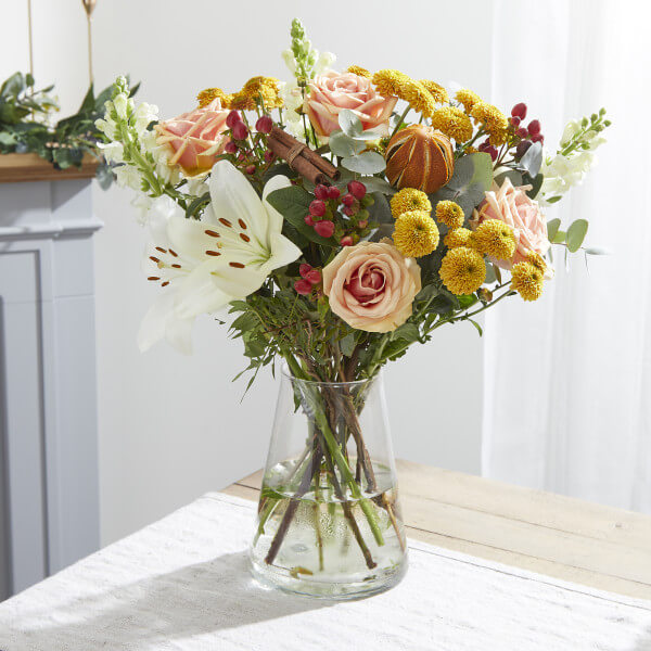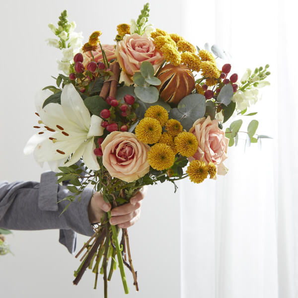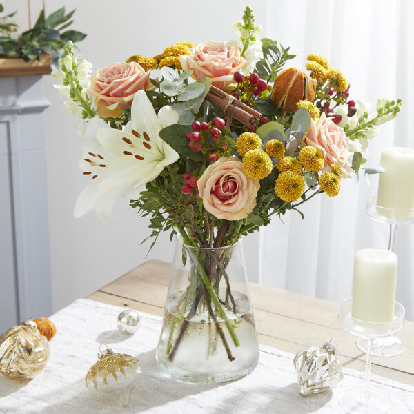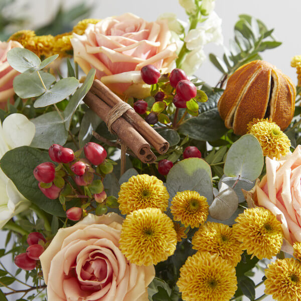 Arranged by hand, this bouquet is as sweet as they make it. Featuring clean white mixed with pastel and fiery tones that are sure to warm any room, it also has a soothing winter aroma. This fragrant bouquet is sure to be a holiday staple. These will be prepped and packed securely, shipped over night with our partner courier. We cannot deliver this item to Northern Ireland, Isle of Wight, Isle of Man, Channel Islands, Highlands of Scotland and Aberdeen, Jersey, Guernsey, Scilly Isles, Argyll, Shetland.